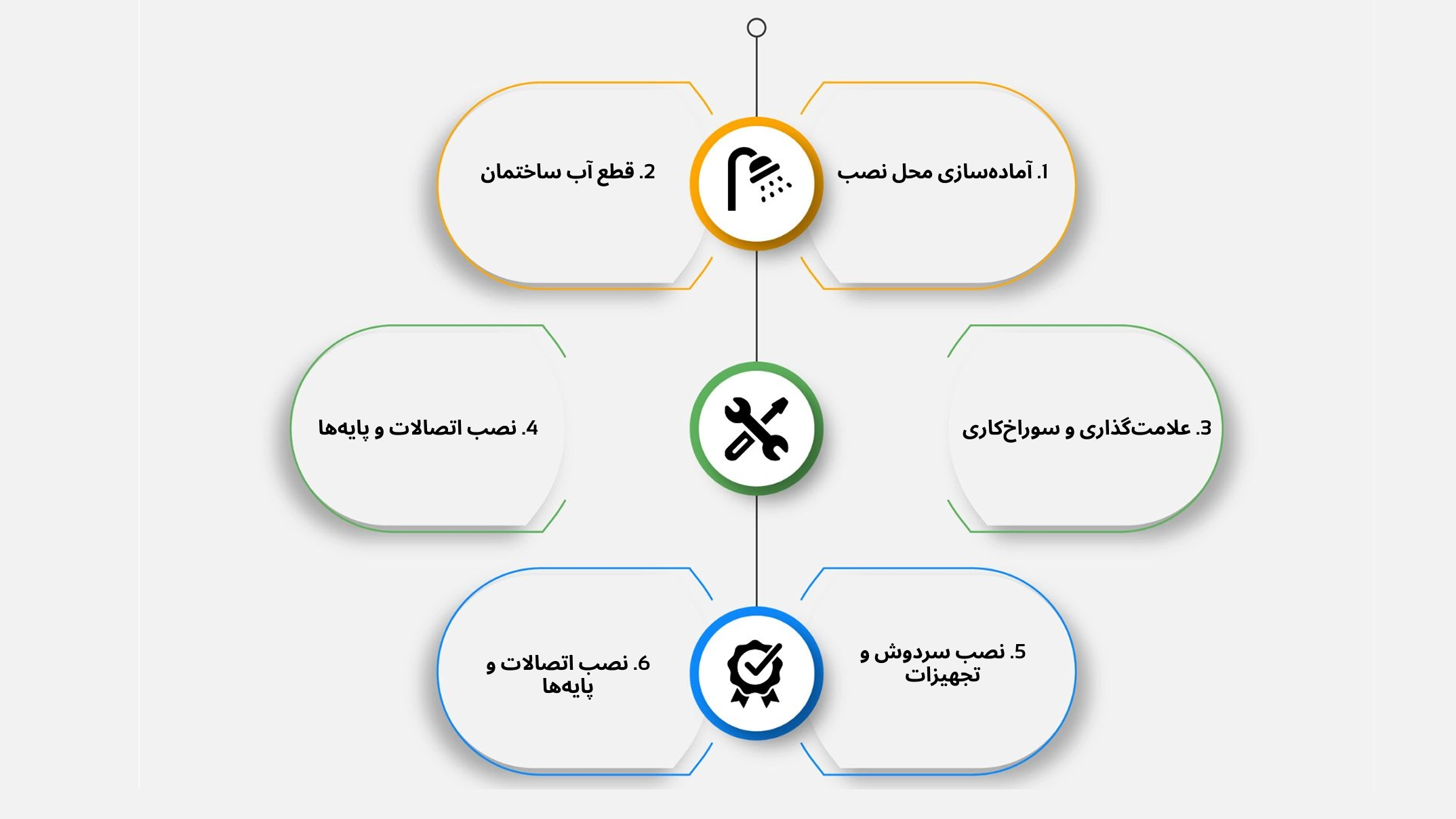 | انتخاب محل نصب | تعیین ارتفاع استاندارد (دوش ثابت: 200-220 سانتیمتر، دوش دستی: 120-150 سانتیمتر) و رعایت فاصله از تجهیزات دیگر |