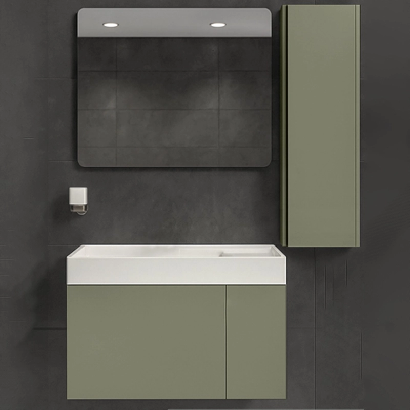 روشویی pvc سایز کوچک در دو رنگ سفید و خاکستری با لبه رنگ چوب، با کاسه روکار کوآرتزی (کورین) از شرکت سنگسان باتیس; این فولست شامل آینه داروخانهای میباشد که دارای فضای مناسب برای نگهداری وسایل سرویس بهداشتی است.
