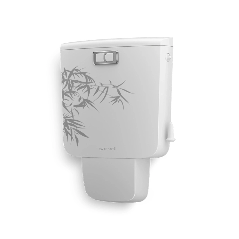 فلاش تانک روکار کاسپین پلاس سفید سارودی با طراحی مدرن، سازگار با توالت زمینی و وال هنگ، دارای سیستم دو زمانه کممصرف، بدنه مقاوم و ۵ سال گارانتی