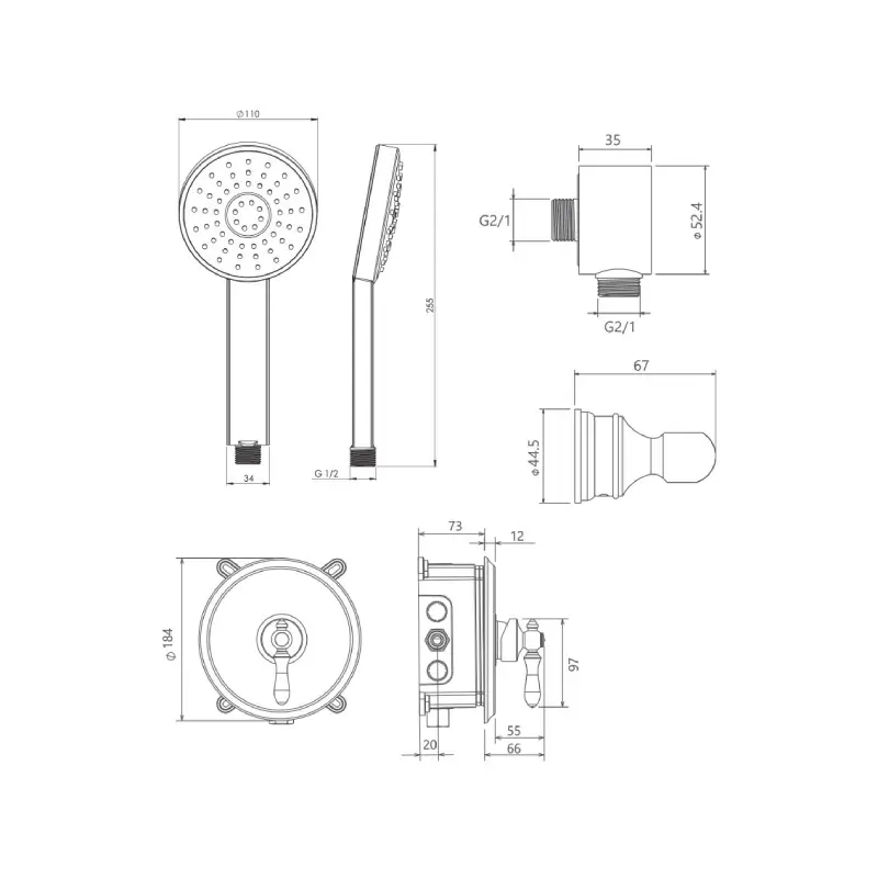 دوش توکار سقفی/دیواری با شیر اهرمی، کارتریج سرامیکی ۳۵ میلیمتری و پرلاتور کممصرف